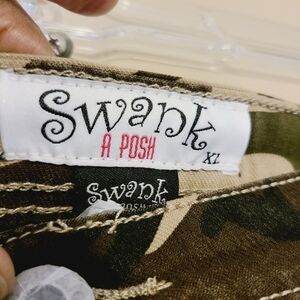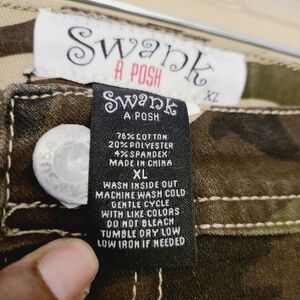 Women’s camouflage SuperGa high waist stretchy skinny jeans by Swank A Posh, size XL. Fabric: 76% cotton, 20% polyester and 4% spandex. No front pockets; two back pockets. Jeans are new without tags; never worn with small loose thread near belt loop (pic 9).
