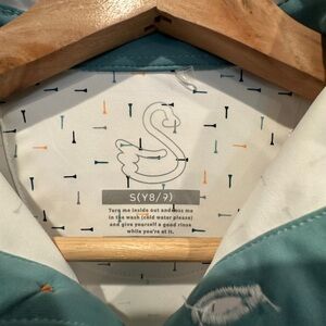 This Swannie polo shirt showcases a fresh white base complemented by green accents, creating a stylish and modern look. Made from lightweight fabric, it offers comfort and breathability, perfect for everyday wear. The classic polo collar and short sleeves add a touch of sophistication to casual outings. Youth size 8/9 NWOT