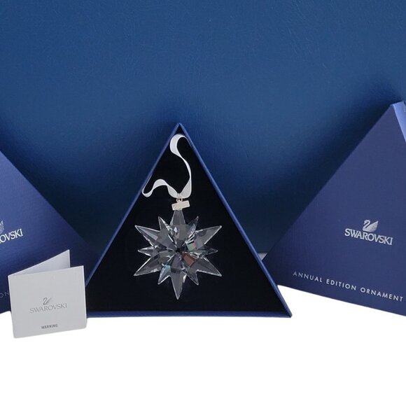 Made in Austria, In 1991 Swarovski began issuing the annual limited edition ornaments in the crystal stars. This 2017 ornament is in great condition and comes inside the box. The glass crystal reflects the lights of the room as they hit the intricate facets of the crystal. The star can by hung from a tree limb or from a holder. Anywhere it is hung, the star is precious as it sparkles. The ornament hangs from a blue satin ribbon and includes a metal year date of 2017. The Swarovski swan can be seen in the metal bail of the ornament.