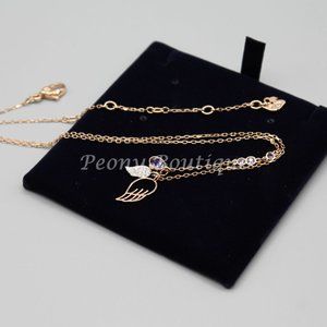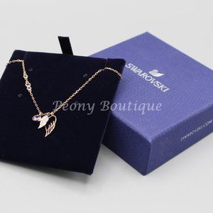 This is a brand new Swarovski crystal necklace from the Symbolic collection. Rose gold color with purple and clear crystals. The larger wing is 1/4" x 1/2" large and the smaller one is 3/8" x 3/16". The necklace is 17" long (excludes the pendant) and the length is adjustable. It is in perfect condition and it comes with original packaging.