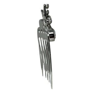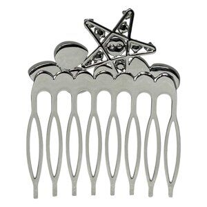 This enchanting silver hair comb features a dazzling star design adorned with rhinestones. Its shimmering elegance evokes celestial beauty, perfect for elevating formal occasions or ceremonies. The comb offers both functionality and style with its sturdy build and intricate detailing, reminiscent of starlit skies.