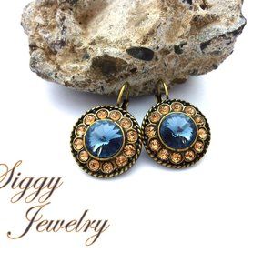 Swarovski crystal statement flower earrings showcasing 10mm denim blue rivoli centers haloed with sparkly light Colorado topaz set in antique brass high quality European settings.
