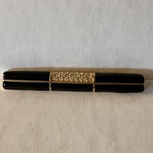 This Swarovski brooch pin is a vintage piece featuring black enamel and crystal accents in a bar style setting. The intricate design is highlighted by the sparkling crystal stones, adding a touch of elegance to any outfit. The brooch is signed by the Swarovski swan and is a perfect addition to any jewelry collection. The piece has a gold and black color scheme, making it versatile for any occasion.