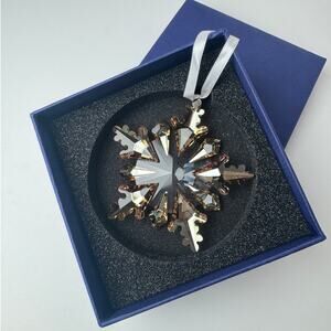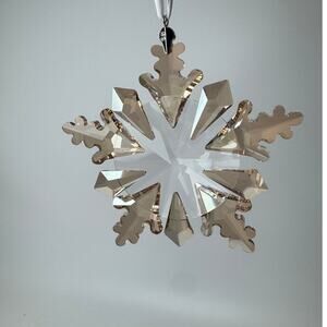This beautiful Swarovski snowflake is inspired by the frosted magic of winter landscapes. Below a white satin ribbon, leaves crafted from crystal with gold tone hues grow out of the center of a sparkling clear crystal into an elegant five-tipped snowflake. Its size and its 145 facets make this ornament the truly striking centerpiece of any winter-themed collection. Easily combined with other ornaments, it is also wonderful present for festive occasions. Decoration object. Not o toy. Not suitable for children under 15.