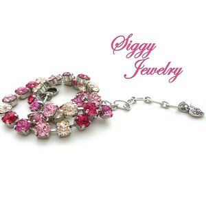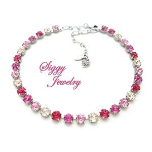 Swarovski Crystal Necklace in a mix of feminine pinks. This pink ombre tennis necklace features four lovely shades of pink. The crystal size is 8mm and the necklace is shown in the rhodium finish. Select your favorite finish from the size menu.