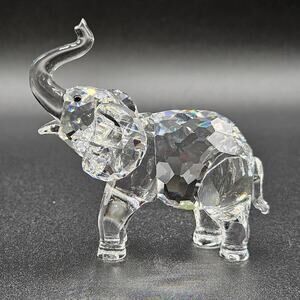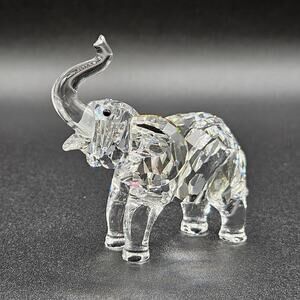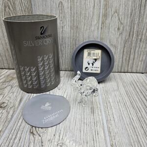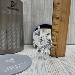 This Swarovski crystal figurine features a charming baby elephant design, perfect for any collector or lover of animals. The figurine is made from high-quality Swarovski crystal and is expertly crafted with attention to detail. It comes in its original box, making it a great addition to any collection or display.