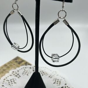 Swarovski Crystal Black Two Leather Cord Dangle Earrings- Handmade NEW