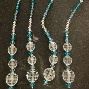 Alternating bicone colors of crystal, teal and smokey blue. 3 chessboard round crystals per strand, 2 small and 1 medium.
