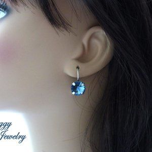 Swarovski crystal rivolis are set into four-prong high quality settings in these versatile and sparkly drop lever-back earrings. Denim blue is a favorite and popular color and is perfect for every day wear and special occasions.
