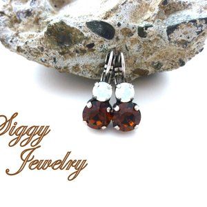 Double stone drop lever-back earrings created with genuine Austrian crystals in 8mm smoked topaz and 5mm white opal, a lovely combination that will complement all of your neutrals.