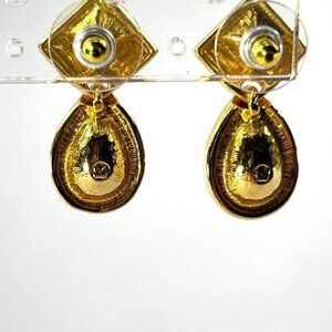 These dressy earrings are in very good pre-owned condition. Using a loupe, I noted a couple minuscule nicks on one of the teardrop crystals. They are not visible without the loupe. The main stone is faceted and pear or teardrop shape and dangles below faceted clear square and black rectangular crystals. Marked with the swan on the back.