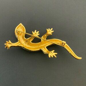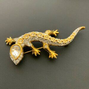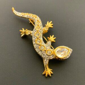 A stunning Swarovski brooch featuring a gecko design with exquisite rhinestones. This gold-tone accessory adds a touch of elegance to outfits.