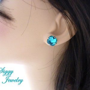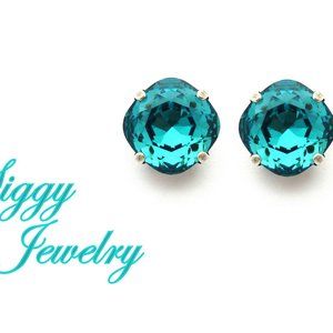 Swarovski crystal Cushion-Cut Solitaire Stud Earrings in teal blue.
