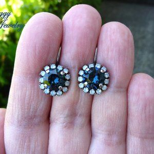 Swarovski crystal drop lever-back halo earrings made with 8mm Montana navy blue haloed with white opals in antique silver finish.