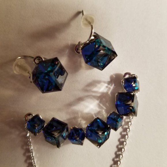 Stunningly beautiful blue Swarovski crystal pendant with a 9" chain and matching blue Swarovski crystal cubic earrings. Perfect for everyday wear or special occasions.