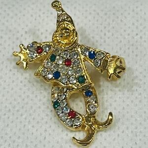 Add a touch of whimsy to your collection with this adorable Swarovski crystal rhinestone clown pin! This charming brooch features a delightful clown design, sparkling with clear Swarovski crystals that catch the light beautifully. The clown's swivel hips and articulated design add a playful touch.