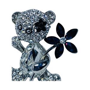 This beautiful brooch pin by ADIBA is a whimsical addition to any jewelry collection. The sparkling silver-plated teddy bear is adorned with icy Swarovski crystals in a teardrop shape for a touch of elegance. Measuring 1.5 inches in length, this brooch is perfect for all occasions including engagement, Mother's Day, Christmas, graduation, wedding, anniversary, formal party, birthday, Confirmation/Communion, and Valentine's Day. The rare teddy bear brooch pin is signed by ADIBA and features a pavé setting style. The icy bling sparkly jewelry is perfect for gift-giving, especially for moms on Mother's Day. This brooch pin is from Egypt and has a whimsical fairy core perfect for collectors of teddy bear jewelry or anyone who loves beauty, art, animals and insects, Bohemian, whimsical fairy tales, and fantasy.