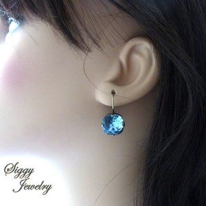 Swarovski crystal denim blue cushion cut drop lever back earrings in assorted finishes.
