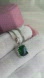 A central emerald green red rectangular stone, surrounded by a halo of tiny crystals.