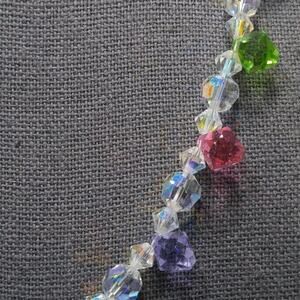 This is a beautiful crystal necklace which has been strung on wire in aurora borealis clear and pastel colored crystal beads with a unique snap clasp. The clasp is dated 2007 and the necklace is 18 inches in length. This necklace would make a great gift or wonderful addition to your own collection.
