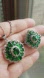 Stones in emerald green and clear. A central, oval, emerald green stone, outlined with a halo of clear crystals, surrounded by more oval-cut emerald green stones, also outlined with halo of clear crystals creating a beautiful, eye catching flower!