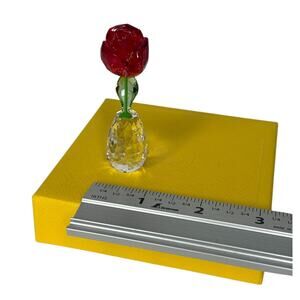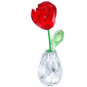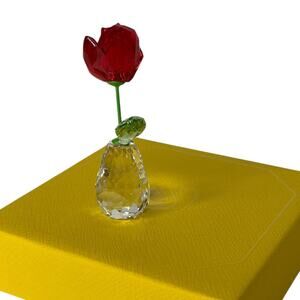 A perfect romantic gift, this beautiful and timeless red rose symbolizes passion and love and will add color and sparkle to any interior. A faceted clear crystal vase, green crystal leaf, and varnished metal stem complete this elegant design. Decoration object. Not a toy. Not suitable for children under 15.