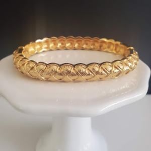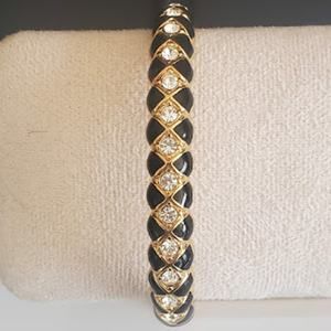 Swarovski hinged bangle has black enamel and crystals on one side and basket weave design on the other. Gold plated. Very good condition with a strong locking clasp. Swan signed.