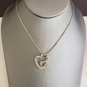 Swarovski Interlocked Hearts necklace has double hearts with clear crystals. Rhodium plated in very good condition. Chain adjusts from 15 to 18 inches with a lobster clasp. Swan signature on both the pendant and the chain.