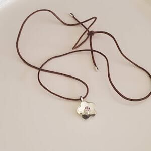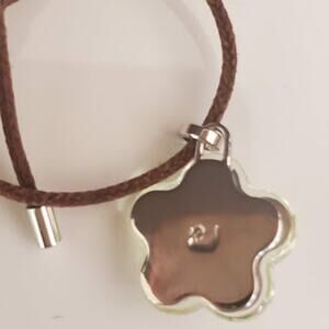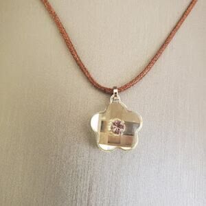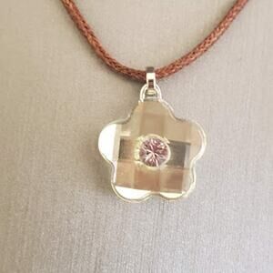 Swarovski faceted flower pendant on a brown cord. Cord is 18 inches long and has rhodium plated hardware. In very good condition. Has Swarovski swan markings on both the pendant and the cord.