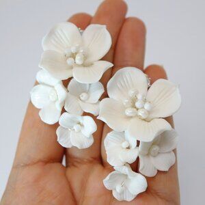 Swarovski Porcelain Ceramic White Flower Pearl Sparkling Crystal Long Bridal Jew