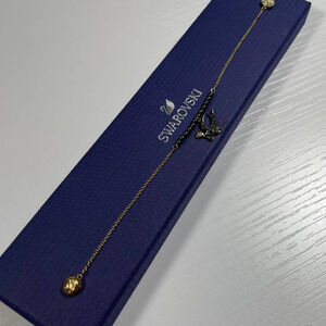 Swarovski Remix Collection Swallow Strand. Realized in a gold-tone plate and features a crystal-embellished swallow motif and a row of scintillating black Crystal Pearls. Collection: Swarovski Remix.