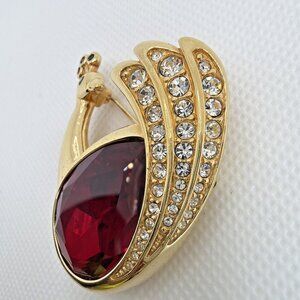 Broche vintage retirado de Swarovski, con un gran cristal rojo facetado, detalles de cristal claro y estructura dorada brillante. Firmado con el sello original del cisne en el reverso, que certifica su autenticidad.