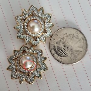 These earrings are gorgeous! Absolute glam all the way. Sadly, there is a small scratch on one pearl as indicated in the photo. When worn, I don't think it would be noticeable, but price reflects the flaw. They are 1" in diameter