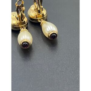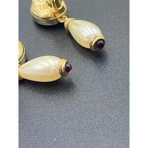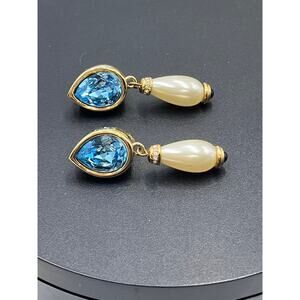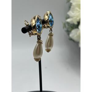 Swarovski gold tone, imitation pearl, and blue and purple crystal clip on earrings.