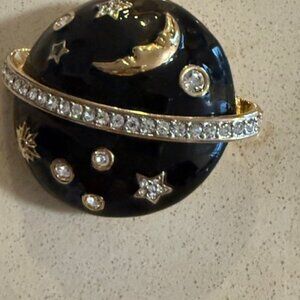 Beautiful Vintage Swarovski Swan Signed Celestial Planet brooch. Fashioned in the shape of a ringed planet it also has a sunburst, moon and stars in gold tone along with Swarovski crystal stars on a BLACK enamel base.
