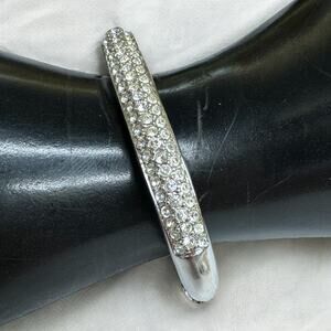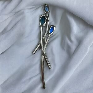 GORGEOUS Swarovski Swan Signed Bracelet Earrings Bracelet Brooch Jewelry Set, Pave Austrian Crystals. The set includes a pave stone silver tone hinged bangle bracelet, Pave Stone Silver Ring (Size 5.5), A set of Silver Tone Rectangular Stud Pave Stone Earrings and a Floral 3 Stem Brooch with Pave Stones up the stems and blue stones mimic the floral petals. See pics for measurements.