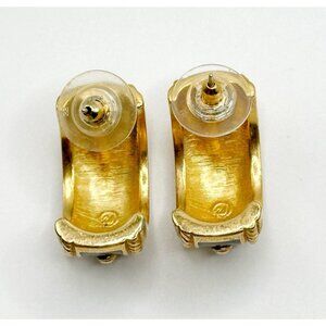 Swarovski Swan Signed Pierced Earrings Black Enamel Clear Crystal Half Hoop