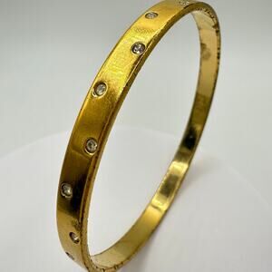 Great condition, shows wear in the form of nicking throughout, mainly to inner edges, leaving one to wonder if the previous wearer was Bowser. No missing clear crystals. Width is 0.25”. Please see photos for inner diameter measurements in inches.