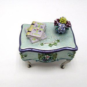 Adorable and sparkly Victorian style desk stands 2 1/8" tall and is in excellent condition. Pale green enamel is encrusted on top with sparkling rhinestones, flowers and books. Interior is a swirled green enamel with magnetic closure. Perfect for ring or small earrings. Nice way to present a gift!!