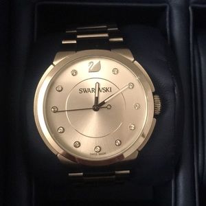 Select trades only. In excellent condition. Has battery and currently runs. Beautiful watch. Large face. I have slightly larger wrists so can fit most wrists. Can go to Swarovski to get links removed or added for free. I have the extra links somewhere but have to find them. Box has flaws on the exterior but it will come with it.