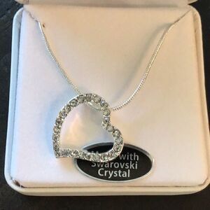 Stunning Swarovski Crystal open heart pendant necklace.Necklace measures 10” in length,has a 2” extension.Swarovski crystals surround the whole heart.Snake chain,lobster claw security clasp. Comes in Leatherette gift box.