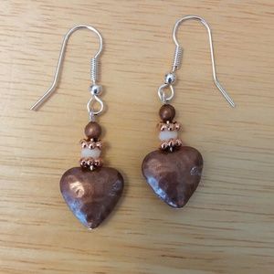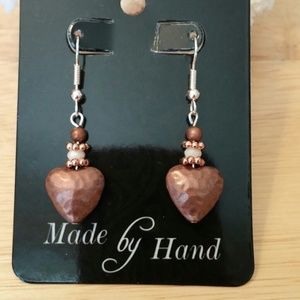 Hammered copper earrings with cream colored crystals. Super cute with jeans.