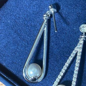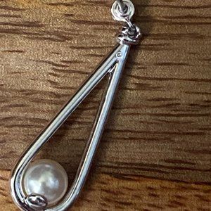 Rhodium plated metal with smooth shiny finish; Crystal embellished love knot motif with fixed pearl; secure and easy closure with bullet pin