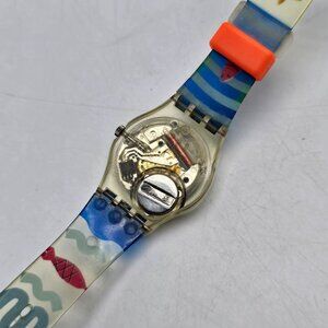 This vintage Swatch watch from 1992 showcases an oceanic theme with playful red clouds and blue stripes. Its 26mm face and silicone band offer comfort and style, making it a unique accessory. The watch highlights Swatch's iconic design and craftsmanship, providing both functionality and a distinctive look for collectors and enthusiasts.