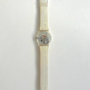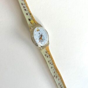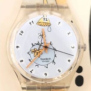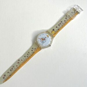 Charming Swatch watch with a floral design. Features a yellow strap and clear case. Perfect for adding a playful touch.