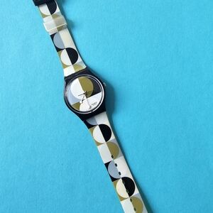 Chic Swatch watch with a bold black and gold pattern. Ideal for a stylish statement. Described as an "optical mod" design with a pattern of circles and squares on both the dial and the multicolor plastic/resin strap, primarily in autumn/winter tones like olive, grey-blue, white, and black.
