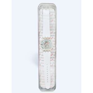 The Swatch Watch FLOATING FLOWERS SUJK130 2007 is a unique and rare timepiece featuring a clear case with a colorful dial. This Swiss-made quartz watch has a 38mm plastic case and a two-piece pink and purple band. It is water-resistant up to 30 meters and comes with its original box and papers. The watch is designed in a casual style with floating flowers on the dial, making it a charming and playful accessory for both men and women. Made in Switzerland, this wristwatch exudes quality craftsmanship and attention to detail.