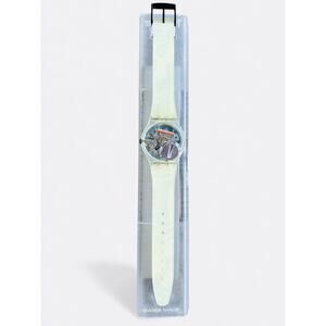 The Swatch Watch PERSPECTIVE GK169 from 1993 is a rare and sought-after timepiece featuring a clear bezel and a multicolor dial with Arabic numerals. This Swiss-made quartz watch is water-resistant up to 30m and comes with its original box and papers. The unisex watch has a 34mm plastic case and a two-piece strap in gray, white, or black, making it a versatile and stylish accessory for any adult. Made in Switzerland, this watch is a timeless piece that showcases both quality craftsmanship and a unique design.