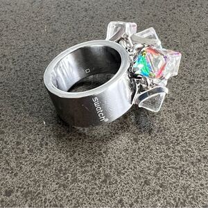 This Swatch ring showcases a wide silver-tone band adorned with a cluster of multi-faceted, cube-shaped crystals. The crystals exhibit an iridescent, rainbow-like effect, offering a distinctive and eye-catching design. The polished metal surface complements the vibrant sparkle of the crystals, creating a modern and artistic accessory.
