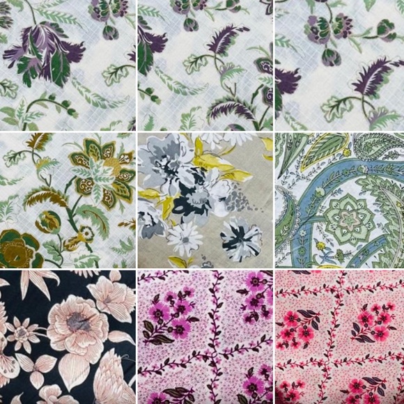 A collection of floral patterned fabrics featuring a variety of colors including purple, green, yellow, and pink. Perfect for crafting and sewing projects.